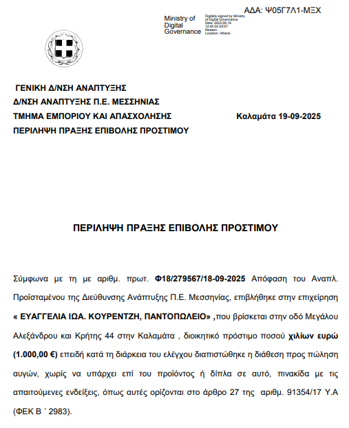 ΚοινωνικαΚυριότερες ειδήσεις της ημέραςΜεσσηνια ΜΕΣΣΗΝΙΑ: Το πρόστιμο των 1.000 ευρώ σε επιχείρηση στην Καλαμάτα -Τι διαπιστώθηκε… by taygetosnews September 23, 2025 written by taygetosnews September 23, 2025 0 comments 64 Η απόφαση από τη Δ/νση Ανάπτυξης Μεσσηνίας: Share 0 FacebookTwitterPinterestThreadsBlueskyEmail taygetosnews previous post …Το σκίτσο της ημέρας! next post «Μηδενική ανοχή στη μη χρήση κράνους» – 173 παραβάσεις στην Πελοπόννησο You may also like ΑΡΓΟΛΙΔΑ: …΄Ετσι έκλεβαν τα ψάρια! October 15, 2025 ΚΟΡΙΝΘΙΑ: “Συναγερμός” για το οστό που βρήκε αγρότης... October 15, 2025 Φοινικούντα: Στο μικροσκόπιο της ΕΛ.ΑΣ. ο ηθικός αυτουργός... October 15, 2025 Από σήμερα η διάθεση του πετρελαίου θέρμανσης October 15, 2025 ΑΡΓΟΛΙΔΑ: Έκλεψε κινητό τηλέφωνο από γυναίκα October 15, 2025 ΜΕΣΣΗΝΙΑ: Εξαρθρώθηκε εγκληματική οργάνωση για διακίνηση ναρκωτικών October 14, 2025 Leave a Comment Cancel Reply Save my name, email, and website in this browser for the next time I comment.