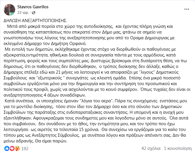 Κατά συνέπεια, οι υποσχέσεις έμειναν “λόγια του αερα”. Πάρα τις συνεχόμενες ενστάσεις μου για το μοντέλο διοίκησης, τόσο στον ίδιο τον Δήμαρχο όσο και στο σύνολο των Δημοτικών Συμβούλων της παράταξης στις ενδοπαραταξιακες συναντήσεις. Η υπομονή και η ανοχή μου εξαντλήθηκαν. Αφουγκραζομαι τους συνδημοτες μου και λογοδοτω μόνο σε αυτούς. Όλα αυτά που συμβαίνουν, δεν συνάδουν με το ήθος, την εντιμότητα μου, και τον τρόπο που έχω λειτουργήσει ως αιρετός τα τελευταία 15 χρόνια. Θα συνεχίσω να εργάζομαι για το καλο του τόπου μας ως Ανεξάρτητος Σύμβουλος, με συνέπεια λόγου και πράξεων απέναντι σας. Δεν θα μείνω αδρανής. Θα είμαι παρών», αναφέρεται από τον Σταύρο Γαβρήλο στο προφίλ του στο facebook.