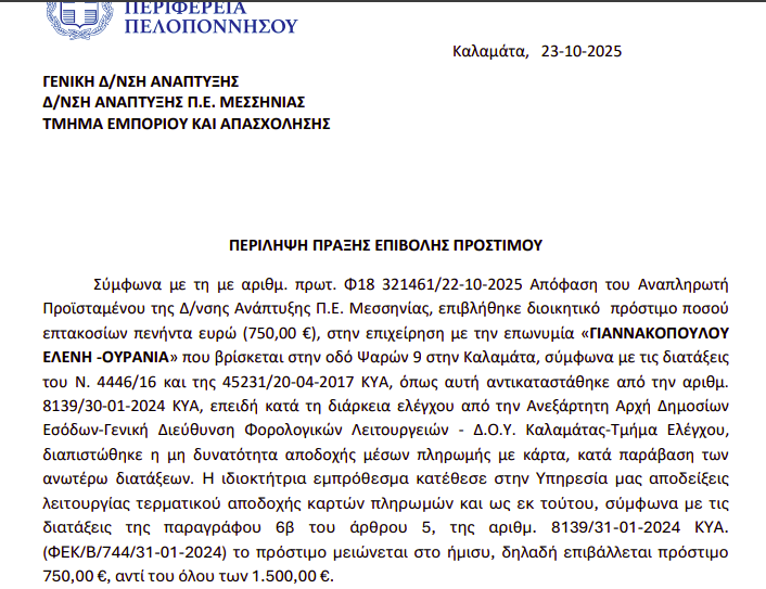 ΚοινωνικαΚυριότερες ειδήσεις της ημέραςΜεσσηνιαΡοη Ειδήσεων ΜΕΣΣΗΝΙΑ: Το πρόστιμο σε επιχείρηση στην Καλαμάτα που από 1.500 ευρώ έγινε 750 ευρώ by taygetosnews October 23, 2025 written by taygetosnews October 23, 2025 0 comments 21 Η απόφαση: Share 0 FacebookTwitterPinterestThreadsBlueskyEmail taygetosnews previous post ΑΡΓΟΛΙΔΑ: Τραυματίστηκε σοβαρά ο χειριστής πλωτού γερανού… next post ΠΕΛΟΠΟΝΝΗΣΟΣ …Ακόμα μία παράταση στο πρόβλημα της διάβρωσης! -Η απόφαση… You may also like ΠΕΛΟΠΟΝΝΗΣΟΣ …Ακόμα μία παράταση στο πρόβλημα της διάβρωσης!... October 23, 2025 ΑΡΓΟΛΙΔΑ: Τραυματίστηκε σοβαρά ο χειριστής πλωτού γερανού… October 23, 2025 Διάκριση στις Βρυξέλλες για τα επιμελητήρια Αρκαδίας και... October 23, 2025 Άλιμος: 15χρονος έπαθε ανακοπή ενώ βρισκόταν σε γυμναστήριο October 23, 2025 ΕΙΣΙΤΗΡΙΑ: ASTERAS B’ AKTOR – ΠΑΣ Γιάννινα October 23, 2025 Το Σαββατοκύριακο ο «ΔΡΟΜΟΣ ΑΘΑΝΑΤΩΝ» – ΤΡΙΠΟΛΗ-ΣΠΑΡΤΗ-ΜΥΣΤΡΑΣ-ΚΑΛΑΜΑΤΑ October 23, 2025 Leave a Comment Cancel Reply Save my name, email, and website in this browser for the next time I comment.