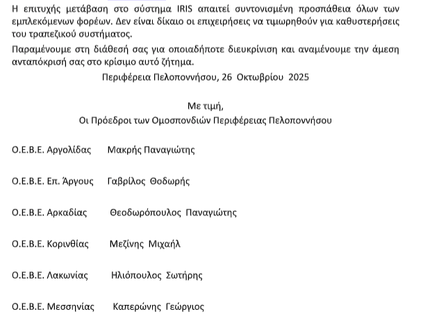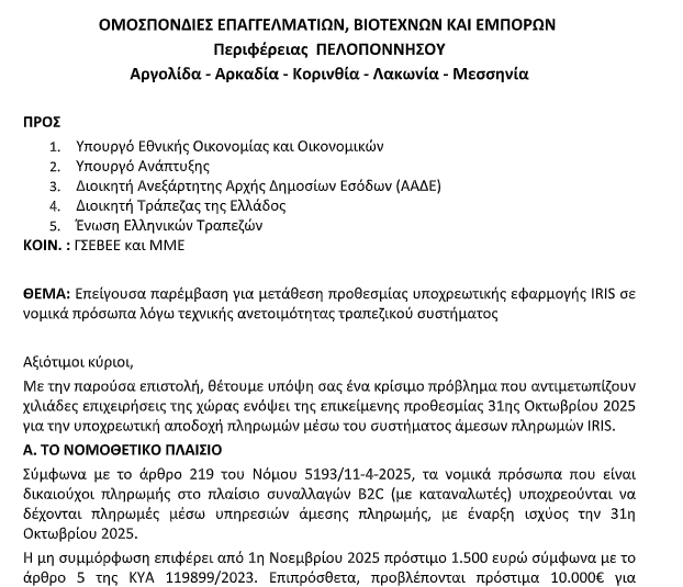 ΑργολιδαΑρκαδιαΚοινωνικαΚορινθιαΚυριότερες ειδήσεις της ημέραςΛακωνιαΜεσσηνιαΠολιτικαΡοη Ειδήσεων Η επιστολή των εμπόρων από Αργολίδα, Αρκαδία, Κορινθία, Λακωνία και Μεσσηνία στους υπουργούς οικονομίας και ανάπτυξης by taygetosnews October 28, 2025 written by taygetosnews October 28, 2025 0 comments 5 Η επιστολή των εμπόρων από Αργολίδα, Αρκαδία, Κορινθία, Λακωνία και Μεσσηνία στους υπουργούς οικονομίας και ανάπτυξης: Share 0 FacebookTwitterPinterestEmail taygetosnews previous post ΚΟΡΙΝΘΙΑ: Ο συνδυασμός του Τατούλη τώρα ρωτάει τη νυν περιφερειακή αρχή για τη διάβρωση ενώ… You may also like ΚΟΡΙΝΘΙΑ: Ο συνδυασμός του Τατούλη τώρα ρωτάει τη... October 28, 2025 ΠΕΛΟΠΟΝΝΗΣΟΣ: Δείτε σε ποιους καταυλισμούς Ρομά θα μπουν... October 27, 2025 Σε θρίλερ έχει εξελιχθεί η υπόθεση εξαφάνισης του... October 27, 2025 Σήκωσαν σιδερένια πόρτα από αγρόκτημα – Που βρέθηκε… October 27, 2025 Εντόπισαν δενδρύλλια κάνναβης μέσα σε καλαμιώνα στην Καλαμάτα October 27, 2025 Έκλεισαν την ΕΑΣ Κιάτου για φορολογικές παραβάσεις! (φωτο) October 27, 2025 Leave a Comment Cancel Reply Save my name, email, and website in this browser for the next time I comment.