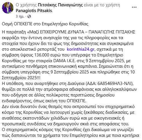 Αφορά τη σύμβαση ύψους 136.000 ευρώ που υπέγραψε το επιμελητήριο Κορινθίας με την εταιρεία DAMA Ι.Κ.Ε. στις 9 Σεπτεμβρίου 2025, με αντικείμενο πενθήμερη επικοινωνιακή καμπάνια! Σημειώνεται ότι η σύμβαση υπεγράφη στις 9 Σεπτεμβρίου 2025 και πληρώθηκε στις 10 Σεπτεμβρίου 2025!!!