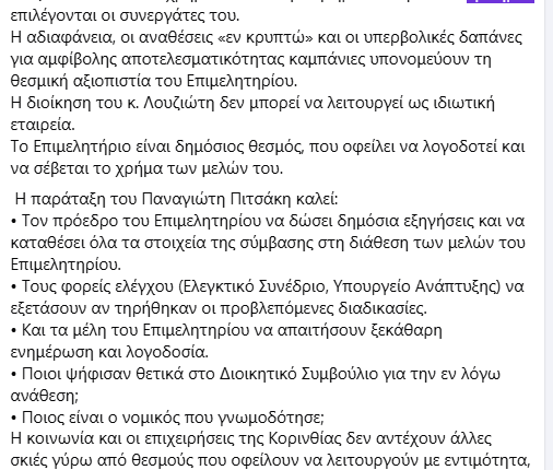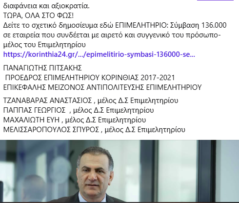 Δείτε τώρα την ανάρτηση στη σελίδα του Π. Πιτσάκη (που πρώτα υπογράφει τις ανακοινώσεις ως πρόεδρος του επιμελητηρίου Κορινθίας 2017-2021 …και μετά ως επικεφαλής της αντιπολίτευσης):