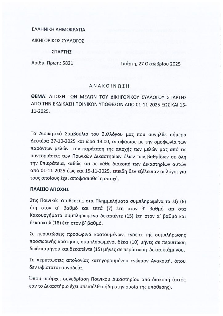 Η αποχή ξεκίνησε με την πρώτη του νέου μήνα. Θα κρατήσει μέχρι και τις 15 Νοεμβρίου 2025. Ο δικηγορικός σύλλογος Σπάρτης, όλους αυτούς τους μήνες, πραγματοποιεί αποχή απ’ τις συνεδριάσεις των ποινικών δικαστηρίων, όλων των βαθμίδων, σ’ όλη την επικράτεια, καθώς και σε κάθε διακοπή των δικαστηρίων, επειδή δεν εξέλειπαν οι λόγοι για τους οποίους έχει αποφασιστεί η αποχή.
