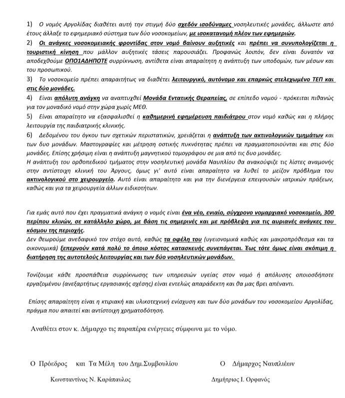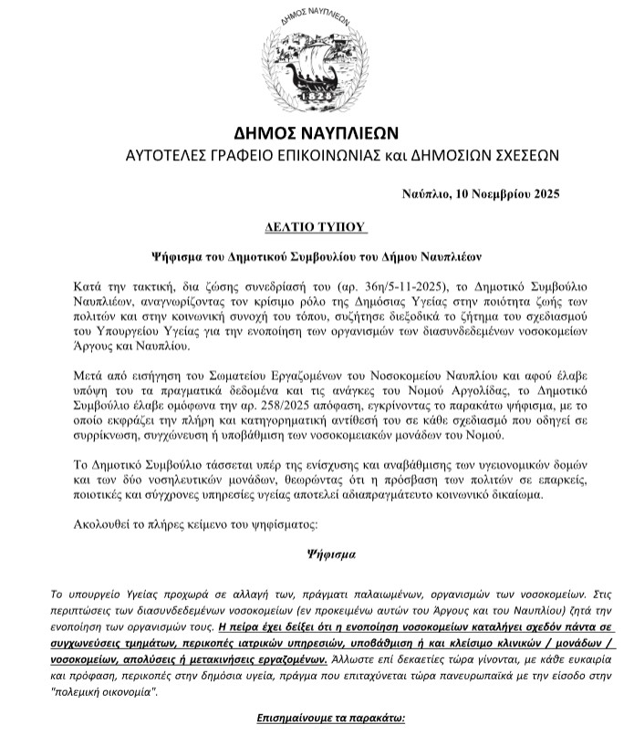 Την πλήρη και κατηγορηματική αντίθεσή του στην ενοποίηση των νοσοκομείων Άργους και Ναυπλίου, αποφάσισε το δημοτικό συμβούλιο Ναυπλιέων με το να εντάσσεται υπέρ του ψηφίσματος του Σωματείου Εργαζομένων του Νοσοκομείου Ναυπλίου.