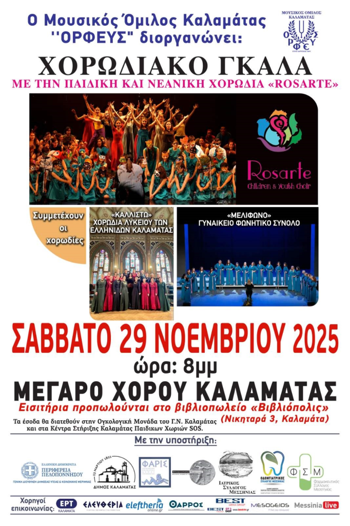 Από το δήμο Δυτικής Μάνης αναφέρεται: «Ο Μουσικός Όμιλος Καλαμάτας «ΟΡΦΕΥΣ» σε συνεργασία με τον Ιατρικό, Οδοντιατρικό και Φαρμακευτικό Σύλλογο Μεσσηνίας διοργανώνουν «Χορωδιακό GALA» στο Μέγαρο Χορού Καλαμάτας, το Σάββατο 29 Νοεμβρίου 2025 με τη συμμετοχή των: