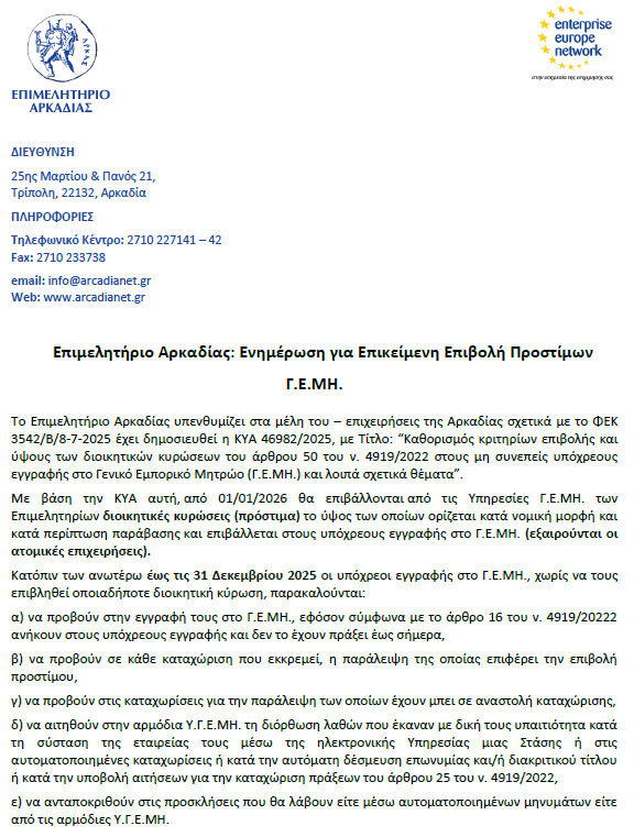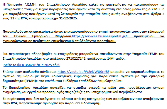 ΑρκαδιαΚοινωνικαΚυριότερες ειδήσεις της ημέραςΡοη Ειδήσεων Επιμελητήριο Αρκαδίας: Ενημέρωση για Επικείμενη Επιβολή Προστίμων Γ.Ε.ΜΗ. by taygetosnews November 13, 2025 written by taygetosnews November 13, 2025 0 comments 1 Share 0 FacebookTwitterPinterestEmail taygetosnews previous post 55χρονος Βούλγαρος έκλεψε μηχανή και τράκαρε… next post Δράση της παιδικής παχυσαρκίας στην Τρίπολη- «Υγιείς Συνήθειες ΣΗΜΕΡΑ, Υγιή παιδιά ΑΥΡΙΟ!» You may also like Κατέληξε ο ηλικιωμένος που έπεσε από μπαλκόνι στο... November 13, 2025 Αργολίδα: Ψαράς «πάλεψε» για να απελευθερώσει καρχαρία (βίντεο) November 13, 2025 «Η Αυτοδιοίκηση δεν είναι ο αδύναμος κρίκος του... November 13, 2025 Ντου της αστυνομίας σε σπίτια στην Κορινθία –... November 13, 2025 Καθαρισμός του Ελλισώνα στο Κιάτο November 13, 2025 Δράση της παιδικής παχυσαρκίας στην Τρίπολη- «Υγιείς Συνήθειες... November 13, 2025 Leave a Comment Cancel Reply Save my name, email, and website in this browser for the next time I comment.