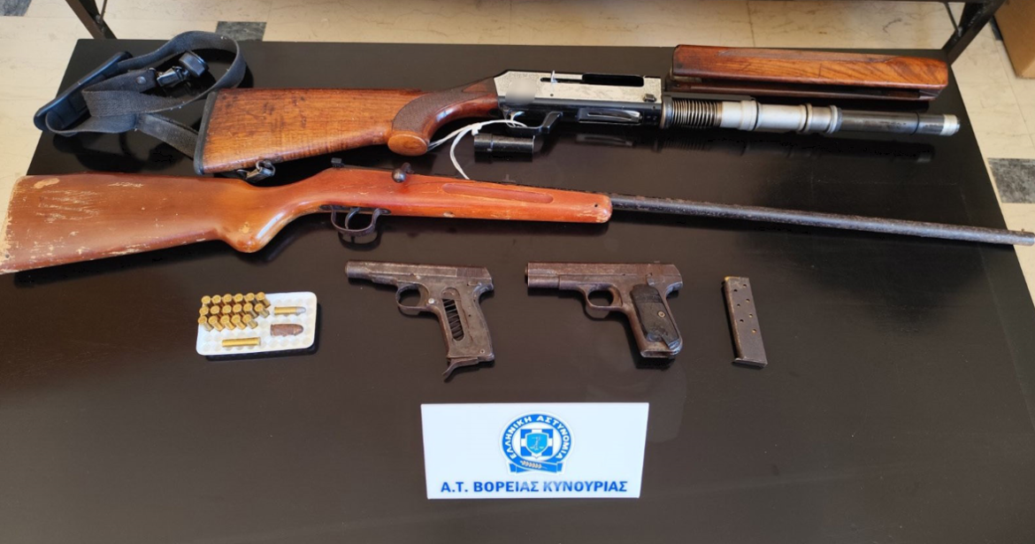 Ύστερα από αξιοποίηση πληροφοριών σε έρευνα που έγινε από αστυνομικούς του ΑΤ Βόρειας Κυνουρίας σε σπίτι 54χρονου στην περιοχή του Άγιου Ανδρέα, βρήκαν κυνηγετικό όπλο, αεροβόλο και πιστόλια τα οποία κατασχέθηκαν.
