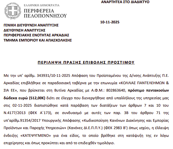 ΑρκαδιαΚοινωνικαΚυριότερες ειδήσεις της ημέραςΡοη Ειδήσεων ΑΡΚΑΔΙΑ: Το πρόστιμο που επιβλήθηκε σε ταβέρνα -Τι διαπιστώθηκε… by taygetosnews November 19, 2025 written by taygetosnews November 19, 2025 0 comments 66 Η απόφαση που δημοσιεύτηκε από την περιφέρεια Πελοποννήσου: Share 0 FacebookTwitterPinterestEmail taygetosnews previous post ΑΡΚΑΔΙΑ: Το πρόστιμο που επιβλήθηκε σε επιχείρηση παροχής γευμάτων -Τι διαπιστώθηκε… next post ΑΡΚΑΔΙΑ: Το πρόστιμο που επιβλήθηκε σε ψητοπωλείο -Τι διαπιστώθηκε… You may also like Ο Πύργος Τσικαλιώτη θα είναι ανοικτός για το... November 20, 2025 Διευθυντής Πρωτοβάθμιας Εκπαίδευσης Κορινθίας: “Θα καλέσουμε σε απολογία... November 20, 2025 Ανανεωμένο και πλήρως λειτουργικό το κλειστό δημοτικό γυμναστήριο... November 20, 2025 Συναντήθηκαν με τον περιφερειάρχη Δ. Πτωχό όπου εκτέθηκαν... November 20, 2025 Καταδυτικό πάρκο στο Ναύπλιο November 20, 2025 Παρουσιάστηκε η εντυπωσιακή τοιχογραφία στο κέντρο της Καλαμάτας November 20, 2025 Leave a Comment Cancel Reply Save my name, email, and website in this browser for the next time I comment.