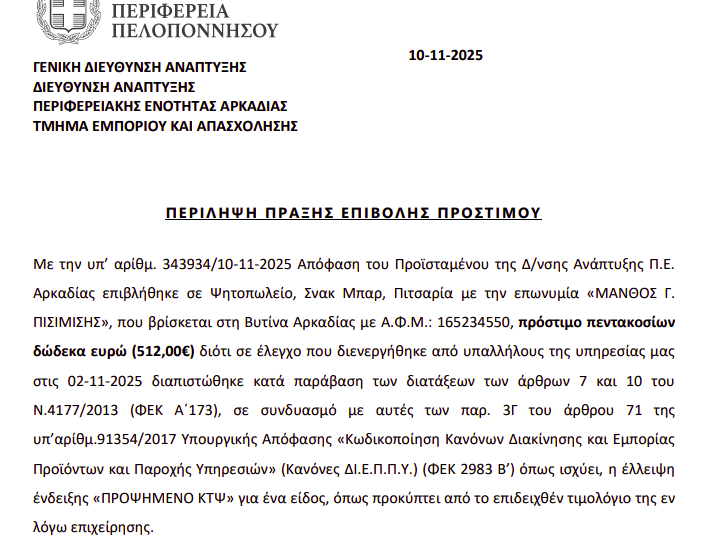 ΑρκαδιαΚοινωνικαΚυριότερες ειδήσεις της ημέραςΡοη Ειδήσεων ΑΡΚΑΔΙΑ: Το πρόστιμο που επιβλήθηκε σε ψητοπωλείο -Τι διαπιστώθηκε… by taygetosnews November 19, 2025 written by taygetosnews November 19, 2025 0 comments 103 Η απόφαση που δημοσιεύτηκε από την περιφέρεια Πελοποννήσου: Share 0 FacebookTwitterPinterestEmail taygetosnews previous post ΑΡΚΑΔΙΑ: Το πρόστιμο που επιβλήθηκε σε ταβέρνα -Τι διαπιστώθηκε… next post Συνελήφθη ο 16χρονος βιαστής στην Πάτρα και οδηγείται στον Εισαγγελέα You may also like Ο Πύργος Τσικαλιώτη θα είναι ανοικτός για το... November 20, 2025 Διευθυντής Πρωτοβάθμιας Εκπαίδευσης Κορινθίας: “Θα καλέσουμε σε απολογία... November 20, 2025 Ανανεωμένο και πλήρως λειτουργικό το κλειστό δημοτικό γυμναστήριο... November 20, 2025 Συναντήθηκαν με τον περιφερειάρχη Δ. Πτωχό όπου εκτέθηκαν... November 20, 2025 Καταδυτικό πάρκο στο Ναύπλιο November 20, 2025 Παρουσιάστηκε η εντυπωσιακή τοιχογραφία στο κέντρο της Καλαμάτας November 20, 2025 Leave a Comment Cancel Reply Save my name, email, and website in this browser for the next time I comment.