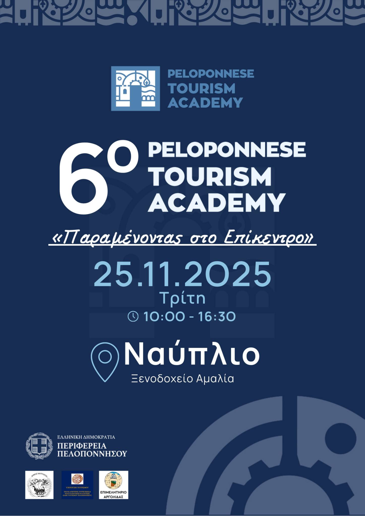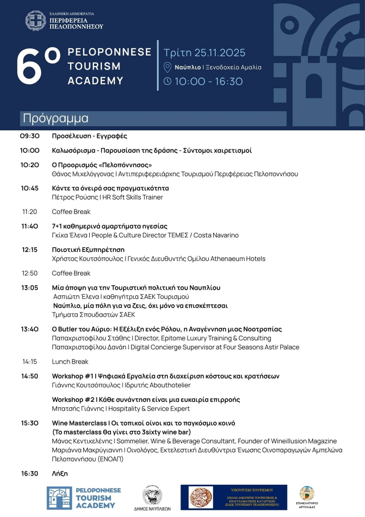 «Το Peloponnese Tourism Academy, η πρωτοβουλία της Περιφέρειας Πελοποννήσου για την ενίσχυση και αναβάθμιση του τουριστικού τομέα σε όλη την Περιφέρεια, συνεχίζεται με τον έκτο του σταθμό, το Ναύπλιο, την Τρίτη 25 Νοεμβρίου 2025,από τις 10:00 έως τις 16:30, στο Ξενοδοχείο Αμαλία Ναυπλίου, με τη ενεργή υποστήριξη και τη σημαντική φιλοξενία του Δήμου Ναυπλιέων.