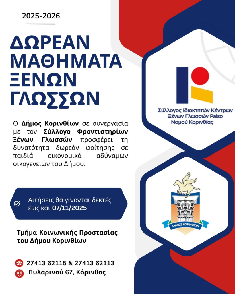 Οι θέσεις αφορούν παιδιά οικονομικά αδύναμων οικογενειών και προσφέρονται από τα φροντιστήρια ξένων γλωσσών του Δήμου μας.