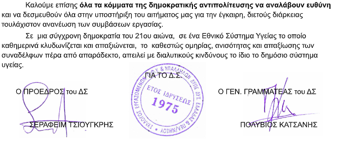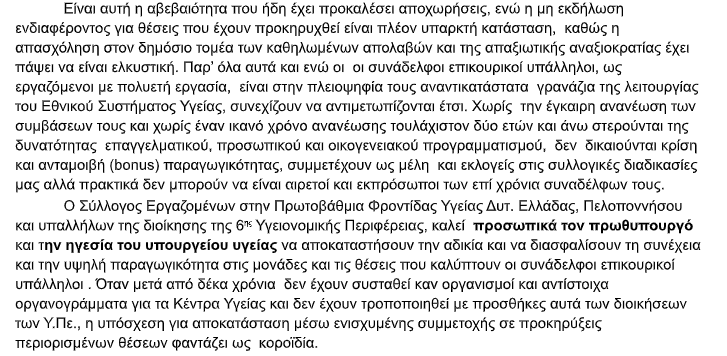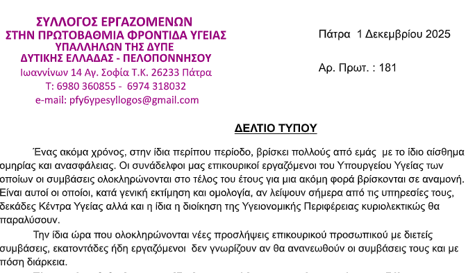 Ο σύλλογος εργαζομένων στην Πρωτοβάθμια Φροντίδα Υγείας Δυτ. Ελλάδας, Πελοποννήσου και υπαλλήλων της διοίκησης της 6 ης Υγειονομικής Περιφέρειας, σε ανακοίνωσή του αναφέρει: