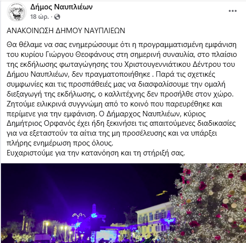 ΑργολιδαΚοινωνικαΠαρασκηνιοΠρωτοσελιδαΡοη ΕιδήσεωνΤοπικη Αυτ/κηση ΝΑΥΠΛΙΟ: …Έψαχναν τον Γιώργο Θεοφάνους! -Οι ενέργειες του δημάρχου! by taygetosnews December 8, 2025 written by taygetosnews December 8, 2025 0 comments 4 Η ανακοίνωση από το δήμο Ναυπλιέων: Share 0 FacebookTwitterPinterestEmail taygetosnews previous post Η είδηση του θανάτου του 28χρονου σκόρπισε θλίψη στην Κορινθία και την ιδιαίτερη πατρίδα του την Αρκαδία! Τι αναφέρει η οικογένεια… You may also like Η είδηση του θανάτου του 28χρονου σκόρπισε θλίψη... December 8, 2025 ΚΑΛΑΜΑΤΑ: …Βρέθηκε οβίδα! December 8, 2025 ΚΟΡΙΝΘΟΣ: Της είπαν ότι είναι αστυνομικοί και την... December 8, 2025 Βρήκαν τον δράστη σε σπίτι στο Καμάρι Ξυλοκάστρου December 8, 2025 Συνελήφθη 26χρονος στο Κρανίδι με ύποπτο δέμα –... December 8, 2025 Εγκατάλειψη στις πυρόπληκτες περιοχές του Κρυονερίου Τριφυλίας –... December 8, 2025 Leave a Comment Cancel Reply Save my name, email, and website in this browser for the next time I comment.