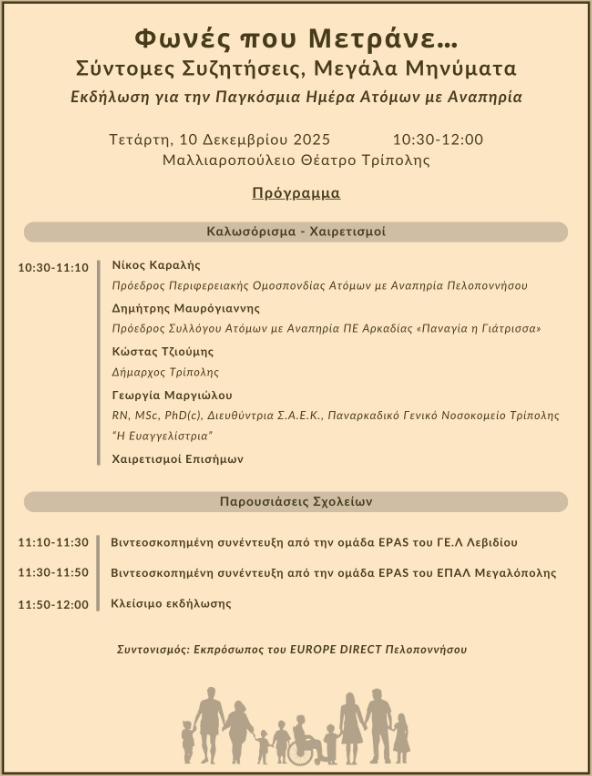 Η Περιφερειακή Ομοσπονδία Ατόμων με Αναπηρία Πελοποννήσου, το ΕUROPE DIRECT Πελοποννήσου, ο Σύλλογος Ατόμων με Αναπηρία ΠΕ Αρκαδίας «Παναγία η Γιάτρισσα», η Διεύθυνση Δευτεροβάθμιας Εκπαίδευσης Αρκαδίας και η ΣΑΕΚ Νοσηλευτικής του Παναρκαδικού Νοσοκομείου Τρίπολης σας προσκαλούν στην εκδήλωση με τίτλο «Φωνές που Μετράνε… Σύντομες Συζητήσεις, Μεγάλα Μηνύματα» η οποία θα πραγματοποιηθεί την Τετάρτη 10 Δεκεμβρίου 2025 στο Μαλλιαροπούλειο Θέατρο Τρίπολης και ώρα 10:30με στόχο να τιμήσει την Παγκόσμια Ημέρα Ατόμων με Αναπηρία.