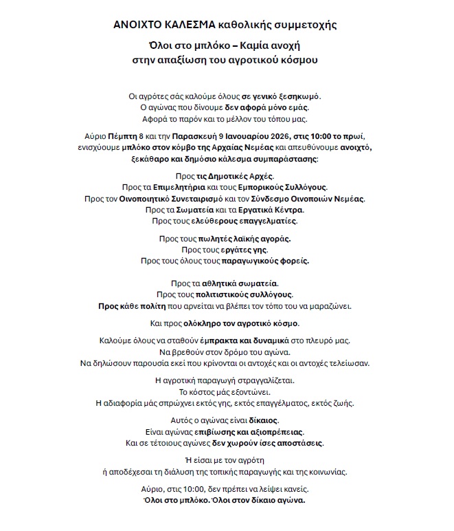 ΑγροτικαΚορινθιαΚυριότερες ειδήσεις της ημέραςΡοη Ειδήσεων ΚΟΡΙΝΘΙΑ: Οι αγρότες ενισχύουν το μπλόκο στον κόμβο στην Αρχαία Νεμέα by taygetosnews January 8, 2026 written by taygetosnews January 8, 2026 0 comments 6 Η ανακοίνωση: Share 0 FacebookTwitterPinterestEmail taygetosnews previous post Ηλεία: Ανεμοστρόβιλος ανέτρεψε αυτοκίνητα στο Γιαννιτσοχώρι και στο Θολό (photos) next post ΚΟΡΙΝΘΙΑ: Θανατηφόρο τροχαίο με θύματα δύο νεαρά άτομα σήμερα το πρωί! (φωτο & βίντεο) You may also like Καιρός: Νέα ψυχρή εισβολή από την Κυριακή –... January 8, 2026 ΚΟΡΙΝΘΙΑ: Θανατηφόρο τροχαίο με θύματα δύο νεαρά άτομα... January 8, 2026 Ηλεία: Ανεμοστρόβιλος ανέτρεψε αυτοκίνητα στο Γιαννιτσοχώρι και στο... January 8, 2026 Κακοκαιρία στην Πάτρα: Πλημμυρισμένοι δρόμοι, χαλάζι και θυελλώδεις... January 8, 2026 Η θάλασσα της Μάνης είναι ο καθρέφτης της... January 8, 2026 Σπάρτη: Θα παρουσιαστεί ένα καινοτόμο εργαλείο πρόγνωσης του... January 8, 2026 Leave a Comment Cancel Reply Save my name, email, and website in this browser for the next time I comment.