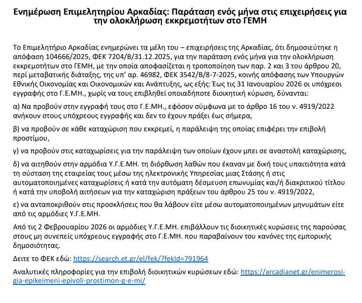 ΑρκαδιαΚυριότερες ειδήσεις της ημέραςΡοη Ειδήσεων Παράταση στις επιχειρήσεις από το Επιμελητήριο Αρκαδίας by taygetosnews January 8, 2026 written by taygetosnews January 8, 2026 0 comments 7 Από το Επιμελητήριο Αρκαδίας αναφέρεται: Share 0 FacebookTwitterPinterestEmail taygetosnews previous post Καλαμάτα: Δόθηκαν οι επιταγές στους αριστούχους φοιτητές ύψους 33.600 ευρώ next post Σπάρτη: Θα παρουσιαστεί ένα καινοτόμο εργαλείο πρόγνωσης του κινδύνου ζημιών από παγετό στα εσπεριδοειδή You may also like Καιρός: Νέα ψυχρή εισβολή από την Κυριακή –... January 8, 2026 ΚΟΡΙΝΘΙΑ: Θανατηφόρο τροχαίο με θύματα δύο νεαρά άτομα... January 8, 2026 ΚΟΡΙΝΘΙΑ: Οι αγρότες ενισχύουν το μπλόκο στον κόμβο... January 8, 2026 Ηλεία: Ανεμοστρόβιλος ανέτρεψε αυτοκίνητα στο Γιαννιτσοχώρι και στο... January 8, 2026 Κακοκαιρία στην Πάτρα: Πλημμυρισμένοι δρόμοι, χαλάζι και θυελλώδεις... January 8, 2026 Η θάλασσα της Μάνης είναι ο καθρέφτης της... January 8, 2026 Leave a Comment Cancel Reply Save my name, email, and website in this browser for the next time I comment.