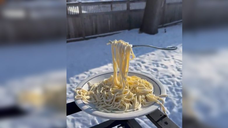 Το βίντεο δείχνει κάποιον να βγάζει ένα πιάτο με φρεσκομαγειρεμένα, ζεστά μακαρόνια στην αυλή ή στο μπαλκόνι του, όπου η θερμοκρασία είναι υπό το μηδέν (συχνά κάτω από τους -30°C).