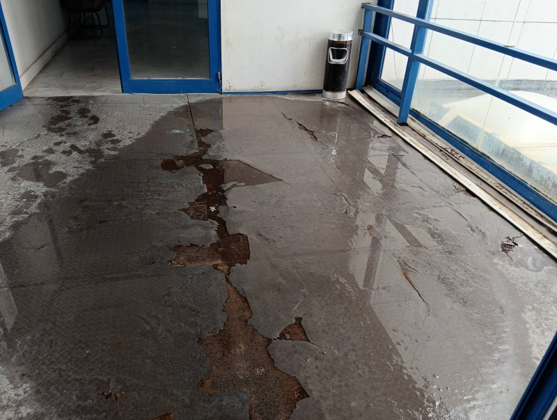 Στο κτήριο “σουρωτήρι”, από το υπόγειο και το ισόγειο μέχρι τον 1ο και τον 2ο όροφο, είχαν σχηματιστεί “λίμνες” και το νερό της βροχής συνέχιζε να πέφτει στο εσωτερικό του κτηρίου, δίπλα στον κόσμο που κυκλοφορούσε.