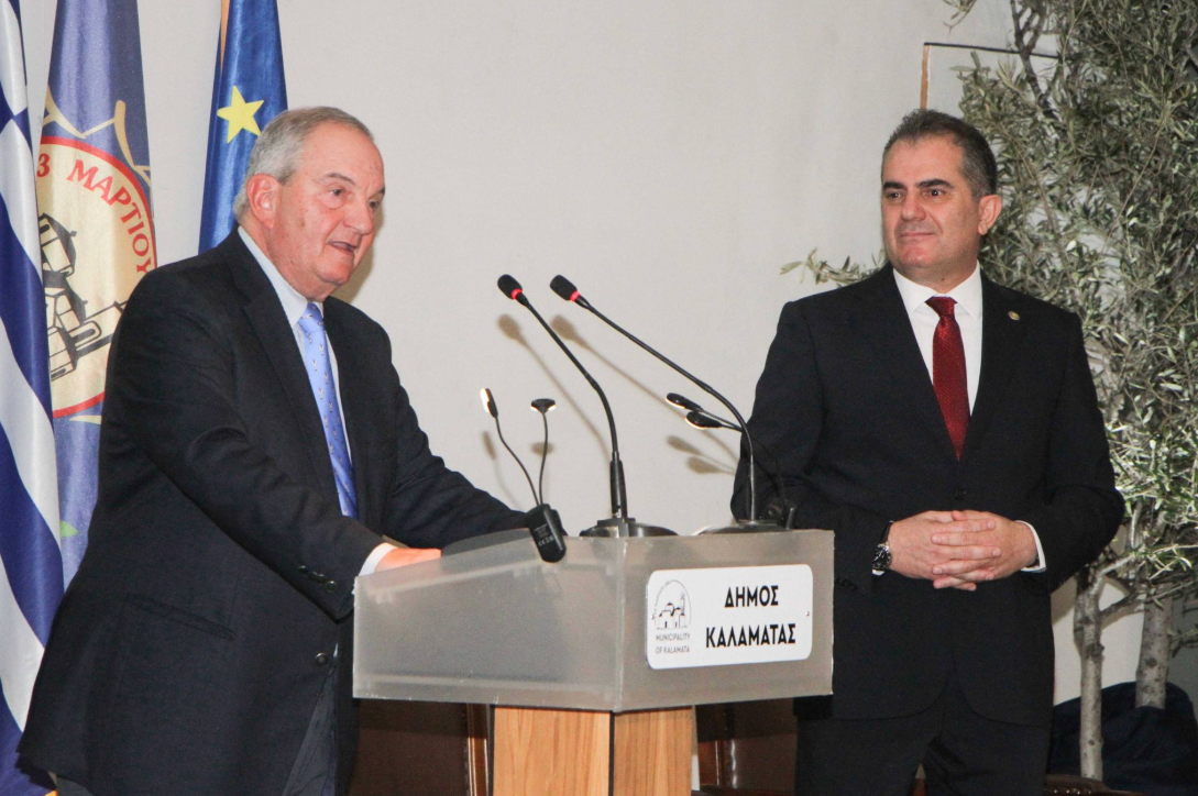 Κύριε Πρόεδρε, σας καλωσορίζουμε στην Καλαμάτα όχι μόνο ως τιμώμενο πρόσωπο, αλλά και ως επίτιμο δημότη της πόλης μας.  Σας ευχόμαστε μακροημέρευση, βέβαιοι ότι θα συνεχίσετε με τρόπο αταλάντευτο να υπηρετείτε Αρχές και Αξίες που ως Έθνος μας ενώνουν και μας κάνουν υπερήφανους».