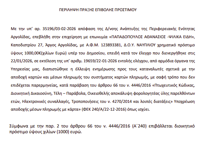 ΑργολιδαΚοινωνικαΚυριότερες ειδήσεις της ημέραςΡοη Ειδήσεων ΑΡΓΟΣ: Το πρόστιμο που επιβλήθηκε σε κατάστημα με ψιλικά είδη -Τι διαπιστώθηκε… by taygetosnews February 11, 2026 written by taygetosnews February 11, 2026 0 comments 14 Η απόφαση που δημοσιεύτηκε από την περιφέρεια Πελοποννήσου: Share 0 FacebookTwitterPinterestEmail taygetosnews previous post ΠΑΤΡΑ: Καυγάς με δύο χρήστες ναρκωτικών …και “μαχαιριές” έξω από τον ΟΚΑΝΑ! -Δεν είναι η πρώτη φορά που συμβαίνει -Ανάστατοι οι κάτοικοι της περιοχής next post Υπόθεση κατασκοπείας: Στις φυλακές Κορίνθου ο 54χρονος σμήναρχος! You may also like Υπόθεση κατασκοπείας: Στις φυλακές Κορίνθου ο 54χρονος σμήναρχος! February 11, 2026 ΠΑΤΡΑ: Καυγάς με δύο χρήστες ναρκωτικών …και “μαχαιριές”... February 10, 2026 ΣΠΑΡΤΗ: Βρέθηκαν ποδήλατα και φυλάσσονται -Τι να κάνουν... February 10, 2026 Τι παρατηρήθηκε κατά τον κατάπλου αλιευτικού σκάφους ιδιοκτησίας... February 10, 2026 Ανάκληση της ένταξης 32 σημαντικών έργων υποδομής από το... February 10, 2026 ΑΣΣΟΣ: Η αγνοούμενη εντοπίστηκε νεκρή σήμερα το μεσημέρι... February 9, 2026 Leave a Comment Cancel Reply Save my name, email, and website in this browser for the next time I comment.