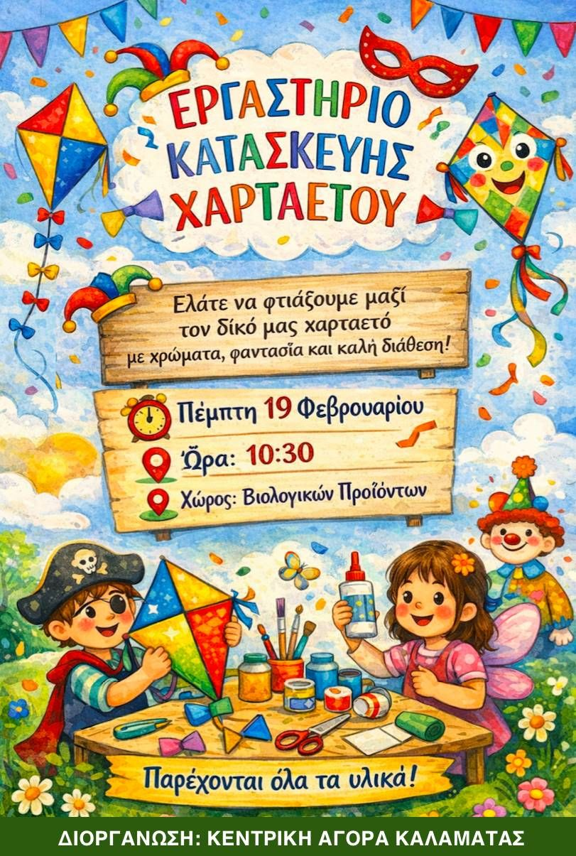 Από το δήμο Καλαμάτας αναφέρεται: «Η Κεντρική Αγορά συνεχίζει τις εξωστρεφείς δράσεις της. Σε αυτό το πλαίσιο, η Κεντρική Αγορά Καλαμάτας καλεί τους μικρούς μας φίλους σε ένα ξεχωριστό δημιουργικό εργαστήριο, την Πέμπτη 19 Φεβρουαρίου 2026 και ώρα 10:30, στον χώρο των Βιολογικών Προϊόντων, για να δημιουργήσουν τους δικούς τους χαρταετούς, γεμίζοντας την ημέρα με χρώμα, φαντασία και χαμόγελα. Παρέχονται όλα τα υλικά».