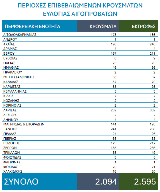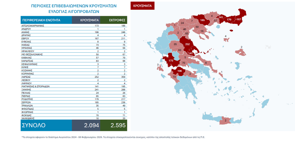 Το Υπουργείο Αγροτικής Ανάπτυξης και Τροφίμων και η Εθνική Επιστημονική Επιτροπή Διαχείρισης και Ελέγχου της Ευλογιάς των αιγοπροβάτων ενημερώνουν ότι η συνολική εικόνα της νόσου για το διάστημα από τον Αύγουστο 2024 έως και 08 Φεβρουαρίου 2026 διαμορφώνεται ως εξής: