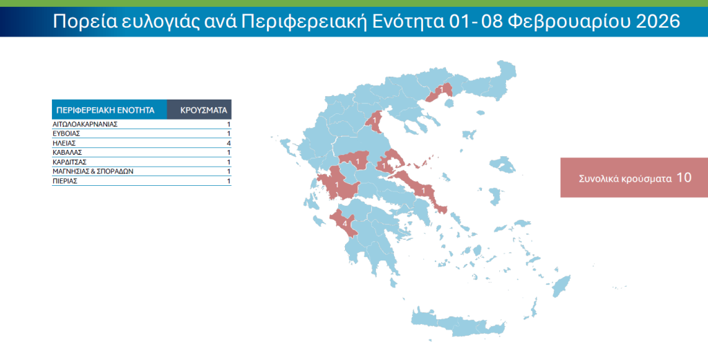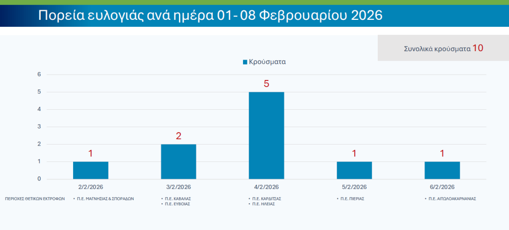 Παράλληλα, για την περίοδο 01–08 Φεβρουαρίου 2026, καταγράφηκαν 10 νέα κρούσματα σε 7 Περιφερειακές Ενότητες: