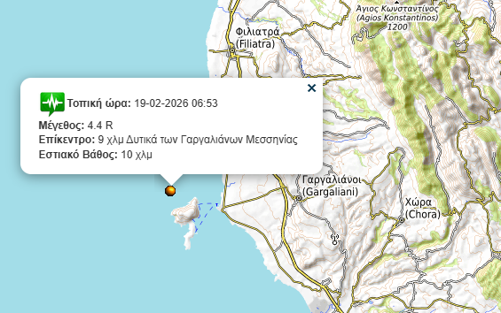 Κυριότερες ειδήσεις της ημέραςΜεσσηνιαΡοη Ειδήσεων Αισθητή σεισμική δόνηση στη Μεσσηνία by taygetosnews February 20, 2026 written by taygetosnews February 20, 2026 0 comments 6 Αισθητή σεισμική δόνηση 4,4 Ρίχτερ σημειώθηκε χθες το πρωί 9χλμ Δυτικά των Γαργαλιάνων. Share 0 FacebookTwitterPinterestEmail taygetosnews previous post ΚΑΛΑΜΑΤΑ: Ρομά παρίσταναν τους υπαλλήλους του ΔΕΔΔΗΕ και εξαπατούσαν ηλικιωμένους You may also like ΚΑΛΑΜΑΤΑ: Ρομά παρίσταναν τους υπαλλήλους του ΔΕΔΔΗΕ και... February 19, 2026 Η σορός του 26χρονου Αλέξη που αγνοούνταν βρέθηκε... February 19, 2026 Βρήκαν τον δράστη για τις κλοπές σε καφενείο... February 19, 2026 Η κατάσταση των σκύλων τον οδήγησαν στη σύλληψη February 19, 2026 Ε.Ο. Τρίπολης – Πύργου: Αποκαταστάθηκε η κυκλοφορία και... February 19, 2026 Στη Γορτυνία ο καθηγητής και πρόεδρος του ΟΑΣΠ... February 19, 2026 Leave a Comment Cancel Reply Save my name, email, and website in this browser for the next time I comment.