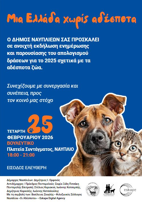 ΑργολιδαΡοη ΕιδήσεωνΤοπικη Αυτ/κηση Δήμος Ναυπλιέων: Μια Ελλάδα χωρίς αδέσποτα by taygetosnews February 25, 2026 written by taygetosnews February 25, 2026 0 comments 4 Share 0 FacebookTwitterPinterestEmail taygetosnews previous post Λουτράκι-Π-Αγ.Θ.: EKO Acropolis Rally 2026 next post Δήμος Σπάρτης: Εθελοντική δενδροφύτευση την Κυριακή You may also like Μακάβριο εύρημα για θανάτους από την Covid-19 February 25, 2026 Δήμος Σπάρτης: Εθελοντική δενδροφύτευση την Κυριακή February 25, 2026 Λουτράκι-Π-Αγ.Θ.: EKO Acropolis Rally 2026 February 25, 2026 Μεσσηνία: Συλλυπητήρια δήλωση Δημάρχου για την εκδημία του... February 25, 2026 24 Φεβρουαρίου 1981: Ο Καταστροφικός Σεισμός Των Αλκυονίδων February 25, 2026 Πρόγραμμα κατάρτισης με επίδομα έως 2.200€: Αιτήσεις για... February 25, 2026 Leave a Comment Cancel Reply Save my name, email, and website in this browser for the next time I comment.