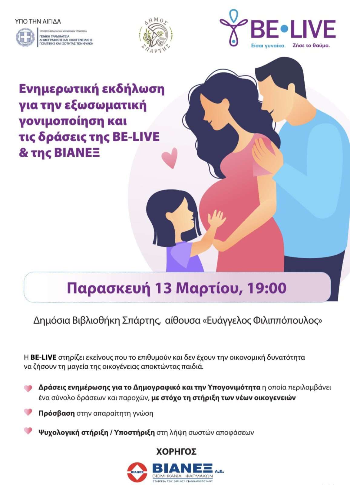 Ο ΔΗΜΟΣ ΣΠΑΡΤΗΣ ΚΑΙ Η BE-LIVE ΣΤΟ ΠΛΕΥΡΟ ΟΙΚΟΓΕΝΕΙΩΝ ΜΕ ΠΡΟΒΛΗΜΑ ΤΕΚΝΟΠΟΙΗΣΗΣ – ΕΝΗΜΕΡΩΤΙΚΗ ΕΚΔΗΛΩΣΗ ΜΕ ΤΗ ΣΤΗΡΙΞΗ ΤΗΣ ΒΙΑΝΕΞ