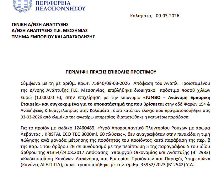 ΜεσσηνιαΠρωτοσελιδαΡοη Ειδήσεων ΚΑΛΑΜΑΤΑ: Το πρόστιμο στο JUMBO -Τι διαπιστώθηκε… by taygetosnews March 16, 2026 written by taygetosnews March 16, 2026 0 comments 12 Η απόφαση: Share 0 FacebookTwitterPinterestEmail taygetosnews previous post ΝΑΥΠΛΙΟ: Τον τσίμπησε η μέλισσα και πέθανε- Πατέρας ενός παιδιού ο άτυχος 46χρονος! You may also like ΝΑΥΠΛΙΟ: Τον τσίμπησε η μέλισσα και πέθανε- Πατέρας... March 16, 2026 Συμμορία Ρομά είχαν ρημάξει στις κλοπές σπίτια στην... March 16, 2026 Συνελήφθησαν 20χρονος και 16χρονος Ρομά για κλοπές στην... March 16, 2026 Πύλος: Παρέσυρε 78χρονο πεζό – Κατέληξε στα τραύματά... March 16, 2026 Κορινθία: 56χρονος δικυκλιστής έχασε τη ζωή του στο... March 16, 2026 Περίεργη υπόθεση με 20χρονο στο Λουτράκι …που του... March 12, 2026 Leave a Comment Cancel Reply Save my name, email, and website in this browser for the next time I comment.